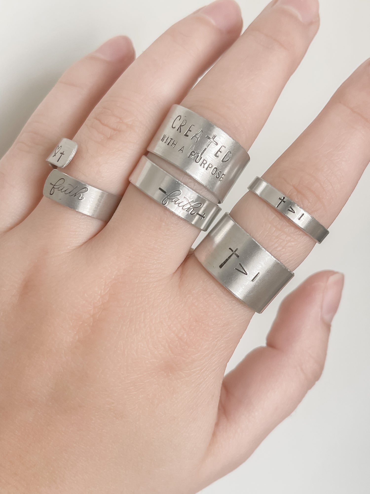 Stamped jewelry is a great way to get custom rings, bracelets, or keychains at an affordable price. All jewelry pieces are adjustable, meaning they can fit larger or smaller fingers/wrists. All silver jewelry is made with aluminum which is non tarnishing and will not turn your finger green!